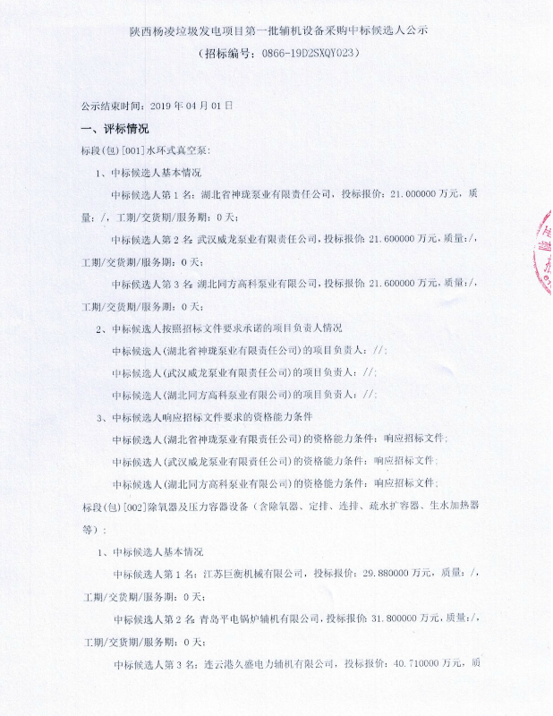 陜西楊凌垃圾發(fā)電工程汽機(jī)房橋式起重機(jī)設(shè)備招標(biāo)采購(gòu)中標(biāo)候選人公示