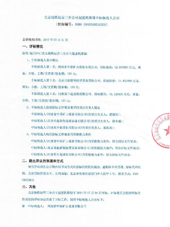 北京地鐵運(yùn)營三分公司起重機(jī)維保中標(biāo)候選人公示