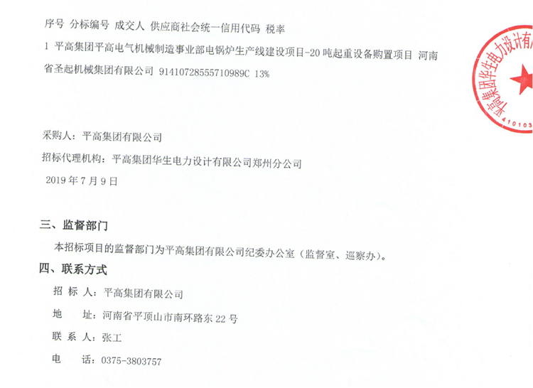 平高集團(tuán)平高電氣機(jī)械制造部電鍋爐生產(chǎn)線建設(shè)項(xiàng)目-20噸起重設(shè)備購置(二次)(競爭性談判)成交結(jié)果公告