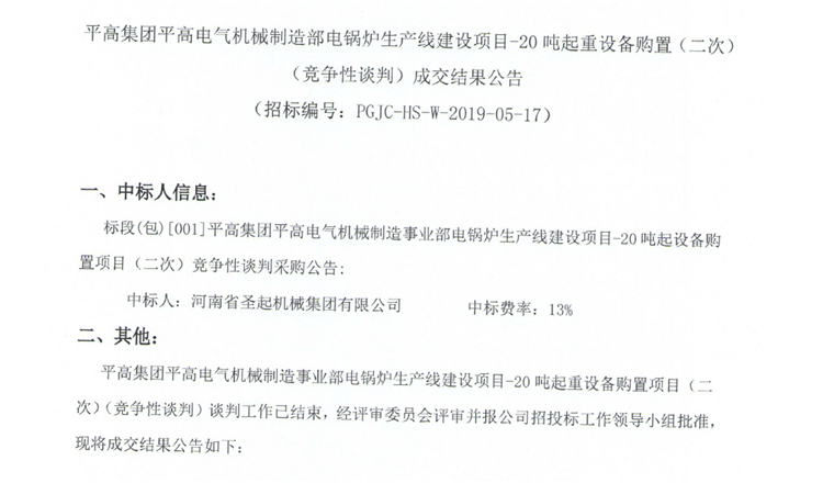 移動(dòng)版:平高集團(tuán)平高電氣機(jī)械制造部電鍋爐生產(chǎn)線建設(shè)項(xiàng)目-20噸起重設(shè)備購置(二次)(競爭性談判)成交結(jié)果公告