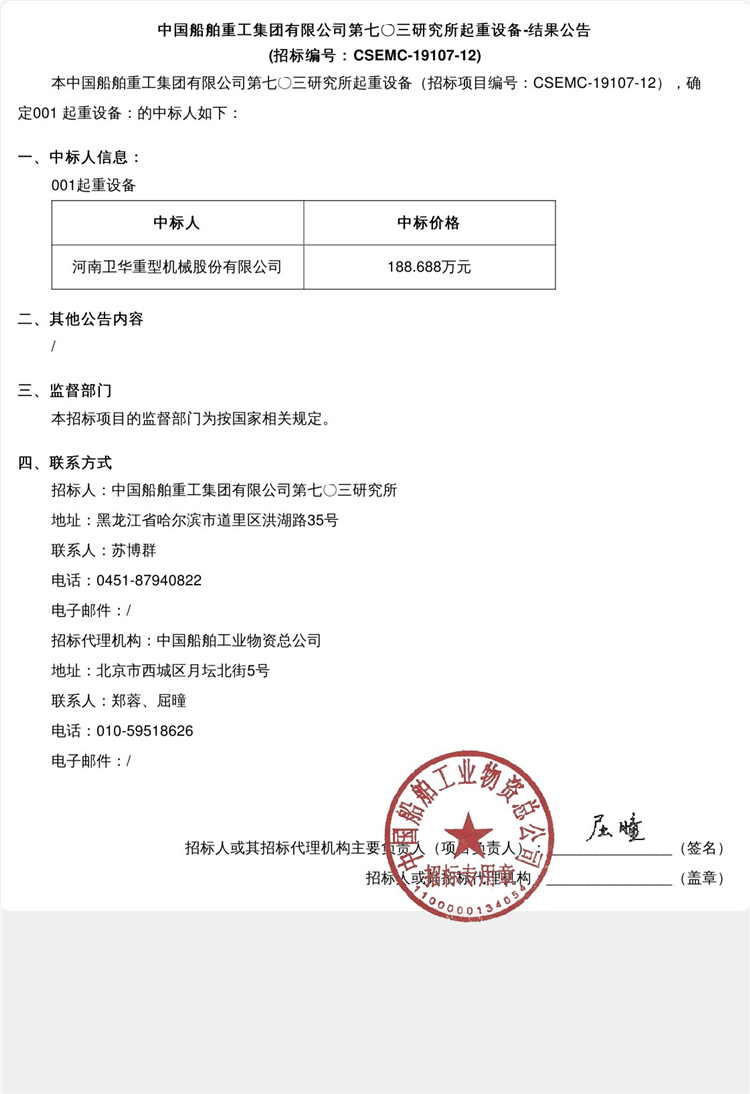中國(guó)船舶重工集團(tuán)有限公司第七〇三研究所起重設(shè)備-結(jié)果公告