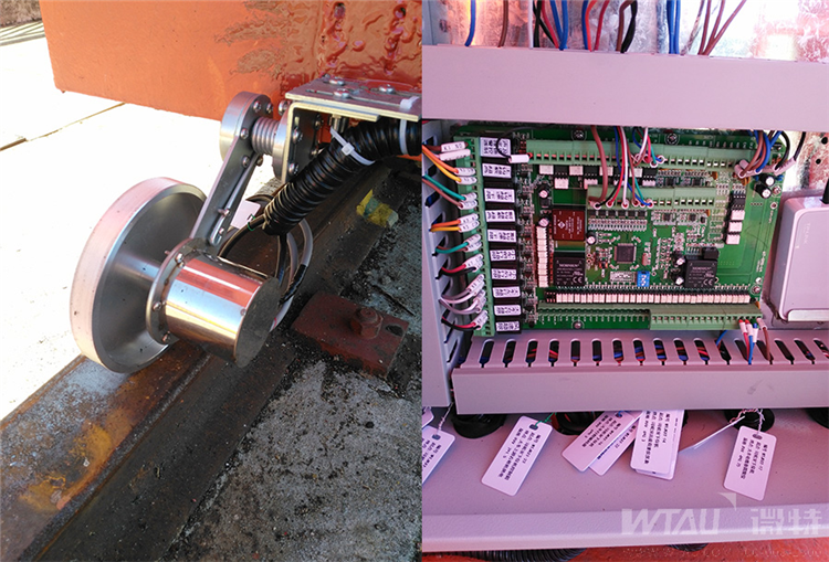 ▲大車行走位移傳感器及電控柜內(nèi)部線路