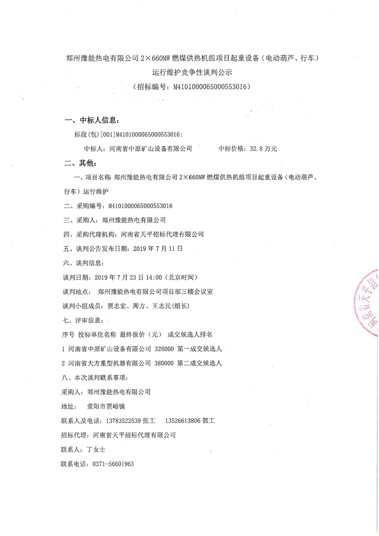 移動版:鄭州豫能熱電有限公司2×660MW燃煤供熱機組項目起重設(shè)備(電動葫蘆、行車)運行維護競爭性談判公示
