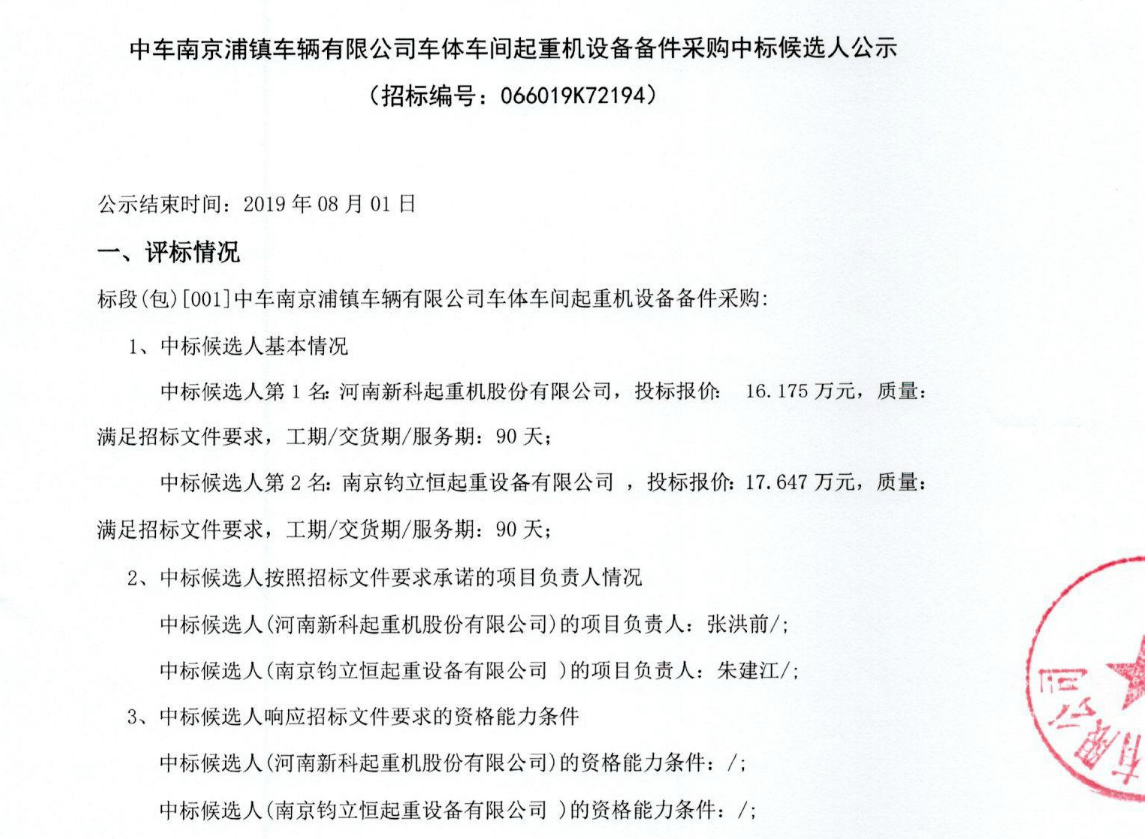 中車南京浦鎮(zhèn)車輛有限公司車體車間起重機(jī)設(shè)備備件采購中標(biāo)候選人公示