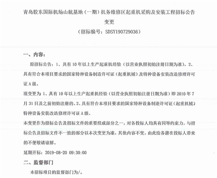 移動版:青島膠東國際機(jī)場山航基地(一期)機(jī)務(wù)維修區(qū)起重機(jī)采購及安裝工程招標(biāo)公告變更