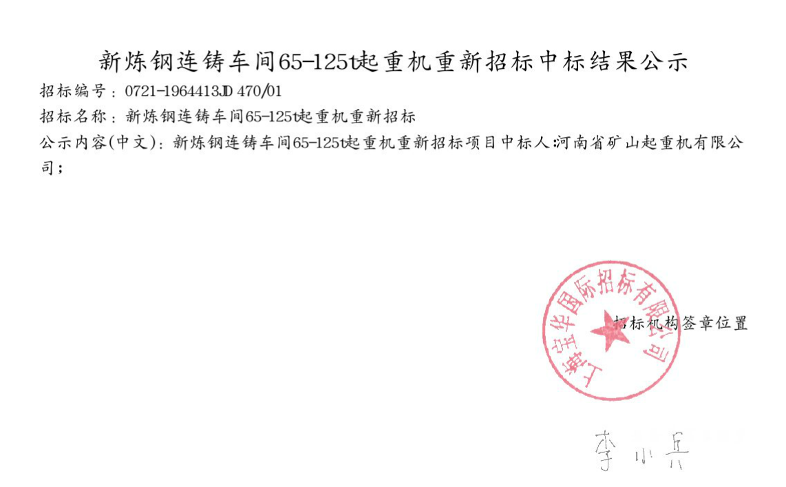 新煉鋼連鑄車間65-125t起重機重新招標(biāo)中標(biāo)結(jié)果公示