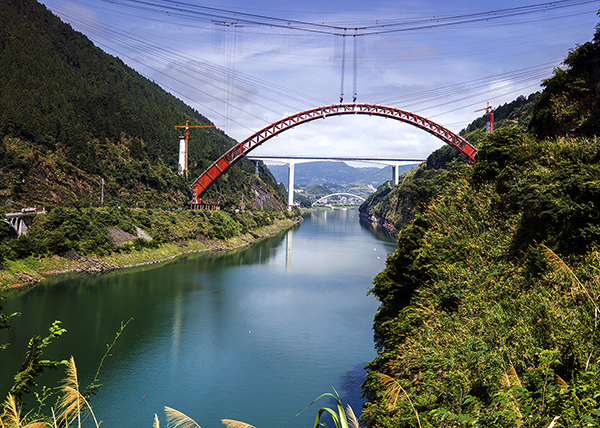依山而筑,地形復(fù)雜,兩側(cè)拱腳高差43.5米。鐵四院設(shè)計(jì)負(fù)責(zé)人張杰介紹,為了完成這個(gè)世界之最的“不平衡美”,設(shè)計(jì)與施工方緊密配合,國內(nèi)首次采用兩片拱肋同時(shí)整節(jié)段吊裝。據(jù)悉,實(shí)施吊裝的纜索吊機(jī),適用于深山峽谷中大型機(jī)械設(shè)備無法進(jìn)場(chǎng)的施工。設(shè)計(jì)吊重300噸,是張吉懷鐵路目前最大噸位的起重設(shè)備。