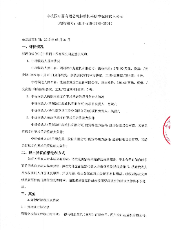 中核四0四有限公司起重機(jī)采購(gòu)中標(biāo)候選人公示
