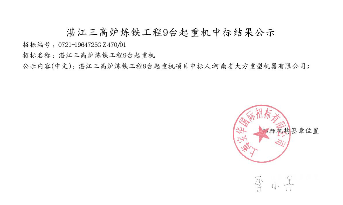 湛江三高爐煉鐵工程9臺(tái)起重機(jī)中標(biāo)結(jié)果公示