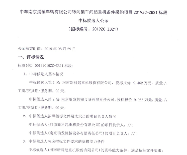 移動(dòng)版:中車南京浦鎮(zhèn)車輛有限公司轉(zhuǎn)向架車間起重機(jī)備件采購項(xiàng)目2019ZC-ZB21標(biāo)段中標(biāo)候選人公示