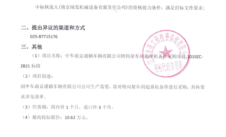 中車南京浦鎮(zhèn)車輛有限公司轉(zhuǎn)向架車間起重機(jī)備件采購項(xiàng)目2019ZC-ZB21標(biāo)段中標(biāo)候選人公示