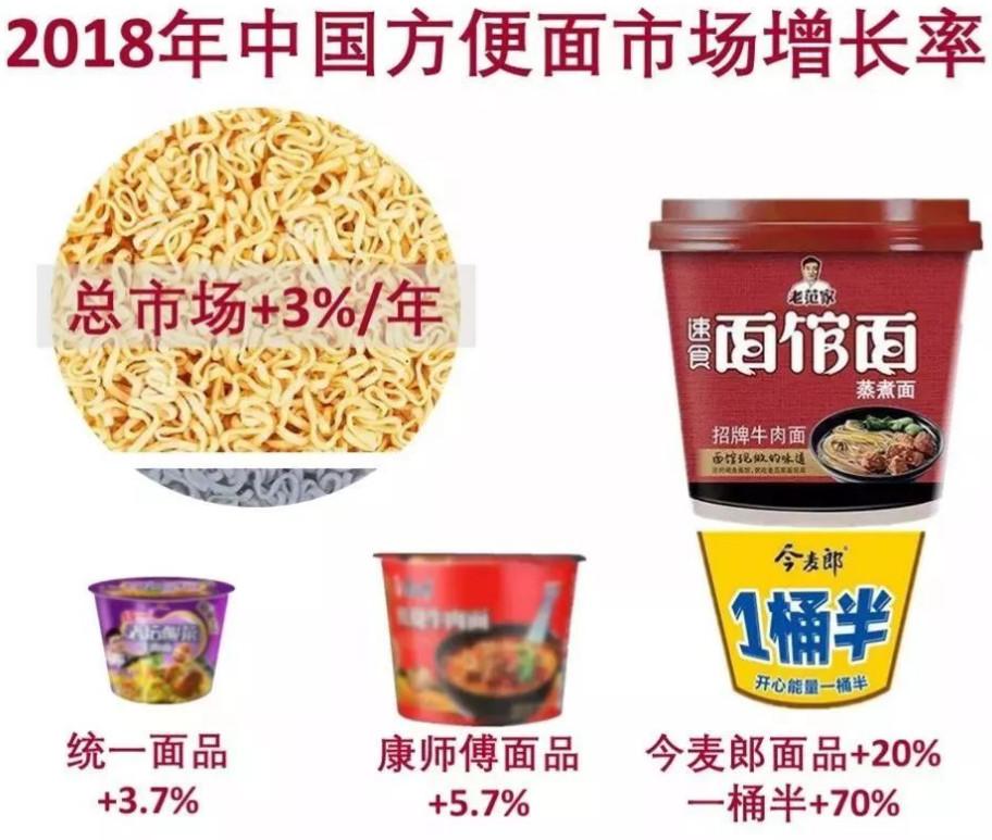 根據(jù)里斯咨詢(xún)的統(tǒng)計(jì),2017-2018年,今麥郎增速同比增長(zhǎng)20%,而同一時(shí)期的康師傅增速為5.7%,統(tǒng)一為3.7%。2018年今麥郎方便面業(yè)務(wù)突破70億,僅僅排在康師傅和統(tǒng)一之后,成為了中國(guó)方便面市場(chǎng)前三甲之一。