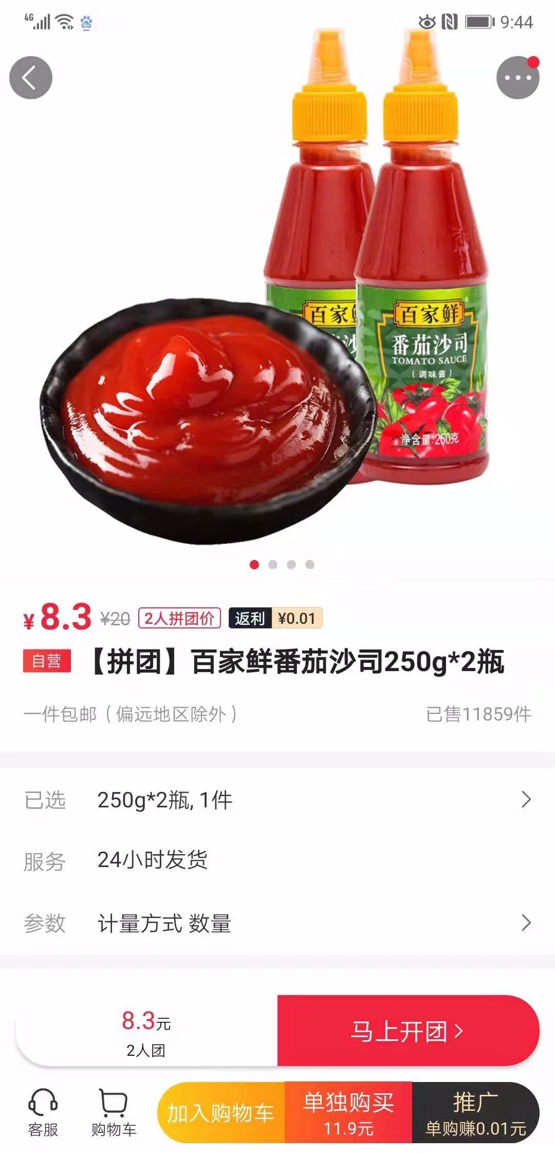 同樣在每日一淘平臺上推出的拼團價為8.3元2瓶的百家鮮番茄沙司,月銷售突破1萬筆。