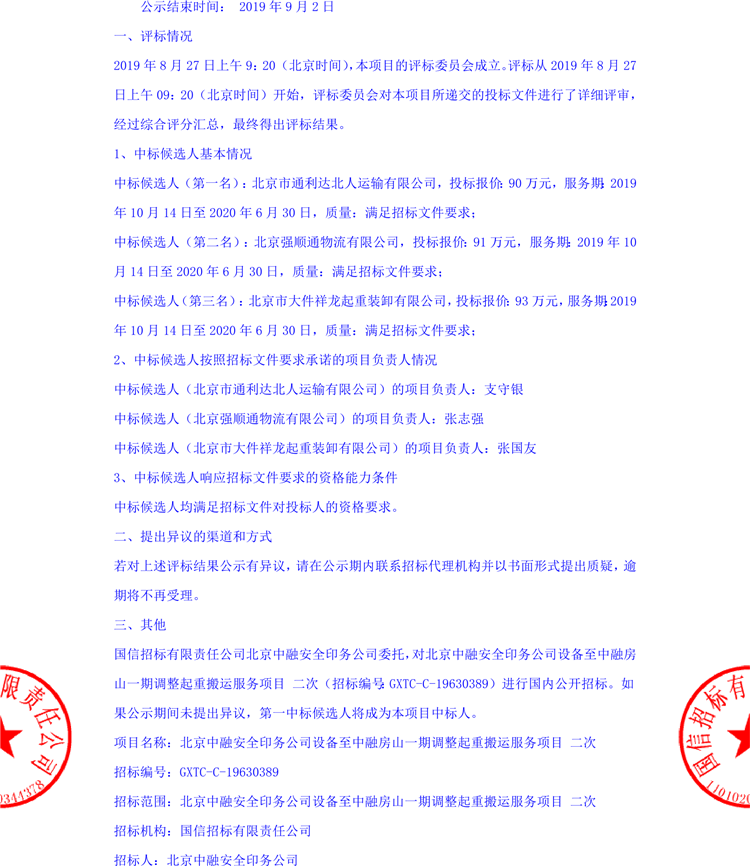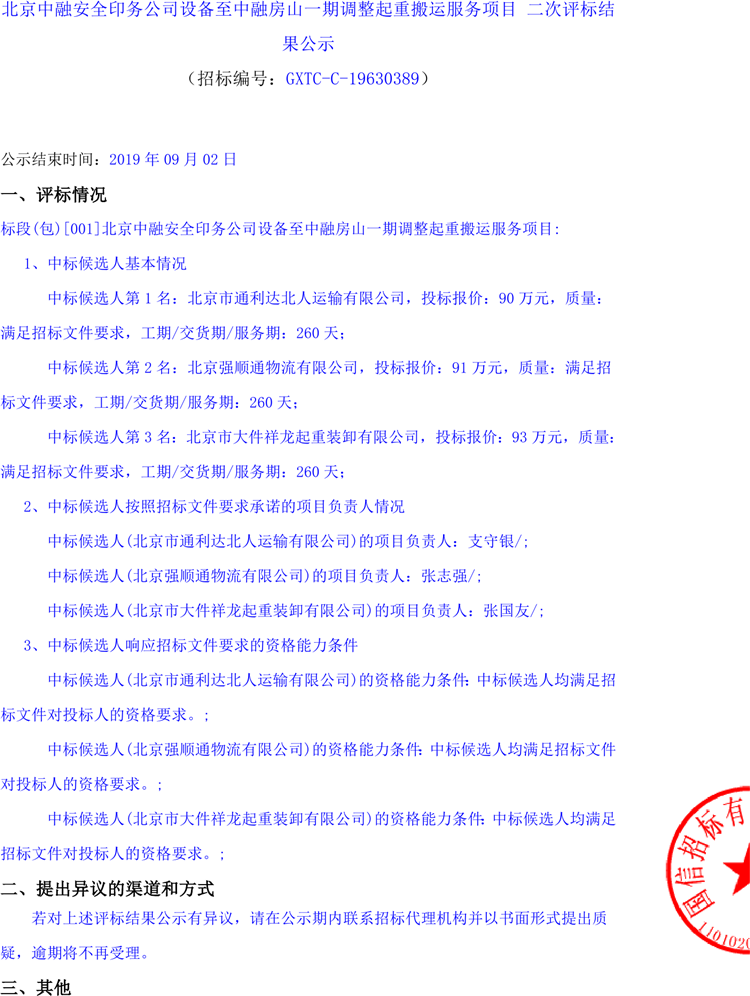 北京中融安全印務公司設備至中融房山一期調(diào)整起重搬運服務項目 二次評標結(jié)果公示