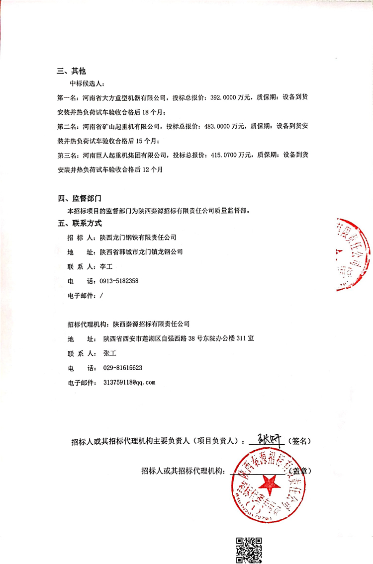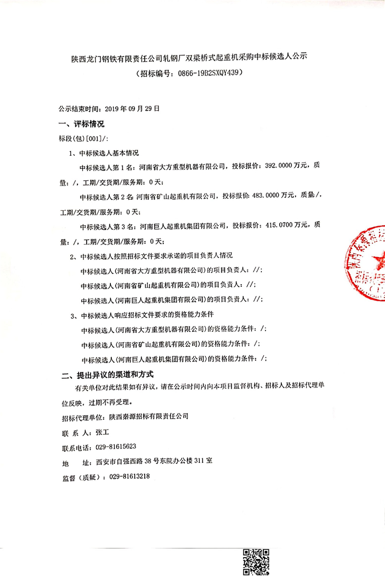 陜西龍門(mén)鋼鐵有限責(zé)任公司軋鋼廠雙梁橋式起重機(jī)采購(gòu)中標(biāo)候選人公示