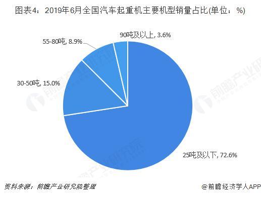 按主要機(jī)型銷(xiāo)量來(lái)看,2019年6月,25噸及以下汽車(chē)起重機(jī)銷(xiāo)量最大,達(dá)到2212臺(tái),占比為72.6%,其中20噸及25噸占比分別為20.1%和41.7%;其次是30-50噸汽車(chē)起重機(jī),銷(xiāo)量達(dá)到456臺(tái),占比為15.0%。