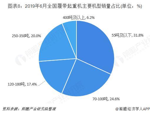 按主要機(jī)型銷(xiāo)量來(lái)看,2019年6月,55噸及以下履帶起重機(jī)銷(xiāo)量最大,達(dá)到62臺(tái),占比為31.8%,其中55噸產(chǎn)品銷(xiāo)售40臺(tái),占比為20.5%;其次是70-100噸履帶起重機(jī)產(chǎn)品,銷(xiāo)量達(dá)到48臺(tái),占比為24.6%。