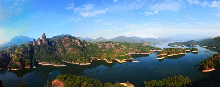 PS:大金湖地質(zhì)公園,國家5A級風景區(qū)。該地質(zhì)公園以丹霞地貌景觀為主體,同時還有花崗巖地貌景觀和人文景觀等點綴其中。丹霞地貌空間分布:北起龍湖鎮(zhèn)的天成巖往西南經(jīng)上清溪、泰寧城關至讀書山、記子頂,后南轉至貓兒山、龍王巖、八仙崖(大牙頂)至龍安鄉(xiāng),依次分布有上清溪、金湖、龍王巖、八仙巖四個紅色盆地。平面上構成近似“人”形的分布格局,北東長34公里,南北長29公里,總面積215.2km2。
