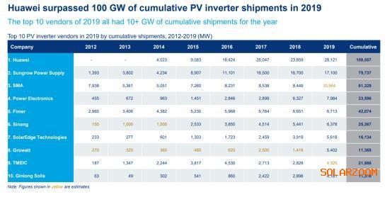 近日,多家機(jī)構(gòu)相繼發(fā)布2019年逆變器出貨量排名報告。其中,Wood Mackenzie發(fā)布的Global solar PV and MLPE inverter market 2020報告顯示,2019年全球光伏逆變器出貨量前2位均是中國企業(yè),其中排名第一的華為2019年出貨量約28.121GW,累計出貨量109.557GW,穩(wěn)居全球首位;IHS Markit報告也指出,2019年全球逆變器出貨TOP10企業(yè)中,有5家是中國企業(yè),華為更是連續(xù)5年蟬聯(lián)冠軍,王者地位不可撼動。