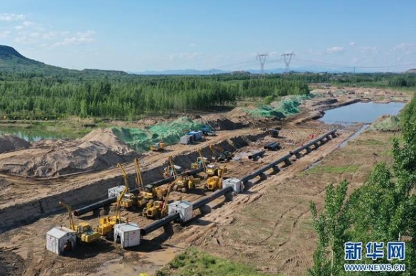 6月4日,工人在河北省灤州市油榨鎮(zhèn)境內(nèi)的灤河河床上進行中俄東線天然氣管道工程(長嶺-永清)第八標(biāo)段施工(無人機照片)。 新華社記者 楊世堯 攝
