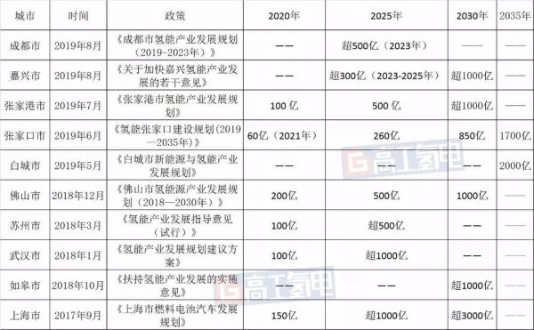 據(jù)高工氫電統(tǒng)計,截止到去年下半年,全國已經(jīng)有佛山、深圳、茂名、成都、北京、株洲等30個多城市發(fā)布相關的氫能規(guī)劃路線圖。除白城市之外,還有成都市、上海市、如皋市、嘉興市、蘇州市、武漢市、張家口市、佛山市、張家港市等城市在規(guī)劃中明確了到2020年、2025年、2030、2035年氫能產(chǎn)業(yè)年產(chǎn)值目標,詳見下表: