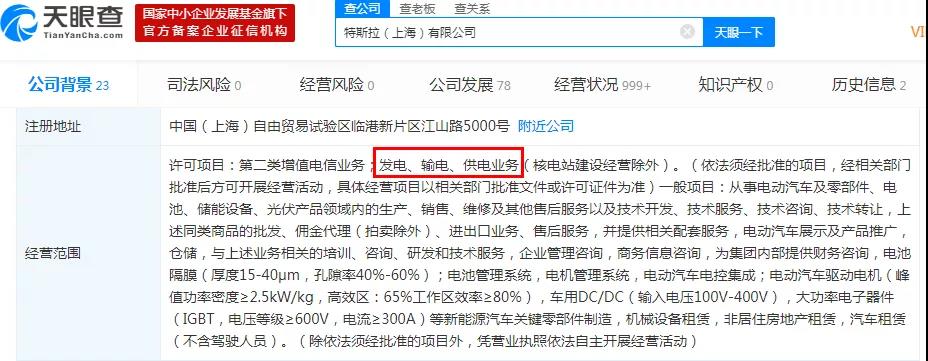 特斯拉新能源汽車上海超級(jí)工廠項(xiàng)目建設(shè)只是一個(gè)開始。據(jù)天眼查信息顯示,5月21日,特斯拉(上海)有限公司的經(jīng)營(yíng)范圍出現(xiàn)變更,新增發(fā)電、輸電、供電業(yè)務(wù)(核電站經(jīng)營(yíng)建設(shè)除外)。