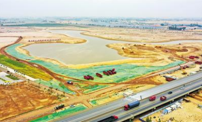 偌大的太極湖已經(jīng)開挖成型,身披朝霞的工人們在河槽邊坡上忙碌著,大型挖掘機平整著地面,土方運輸車輛來往穿梭。