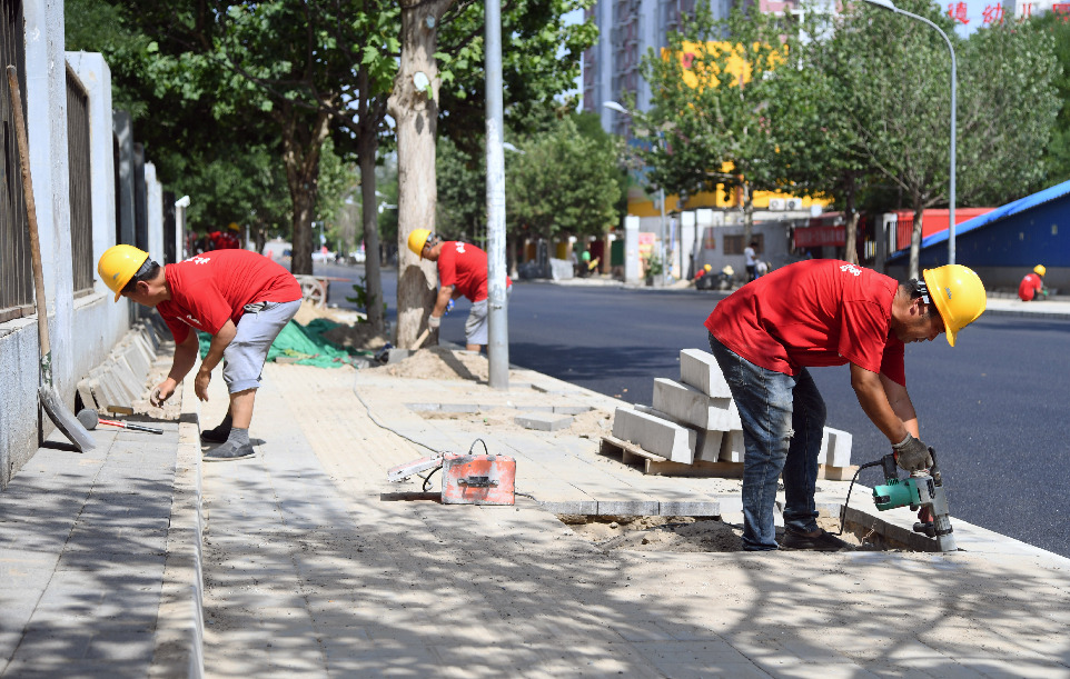 6月12日,施工人員對(duì)人行步道進(jìn)行修繕(新華社記者 任超 攝)