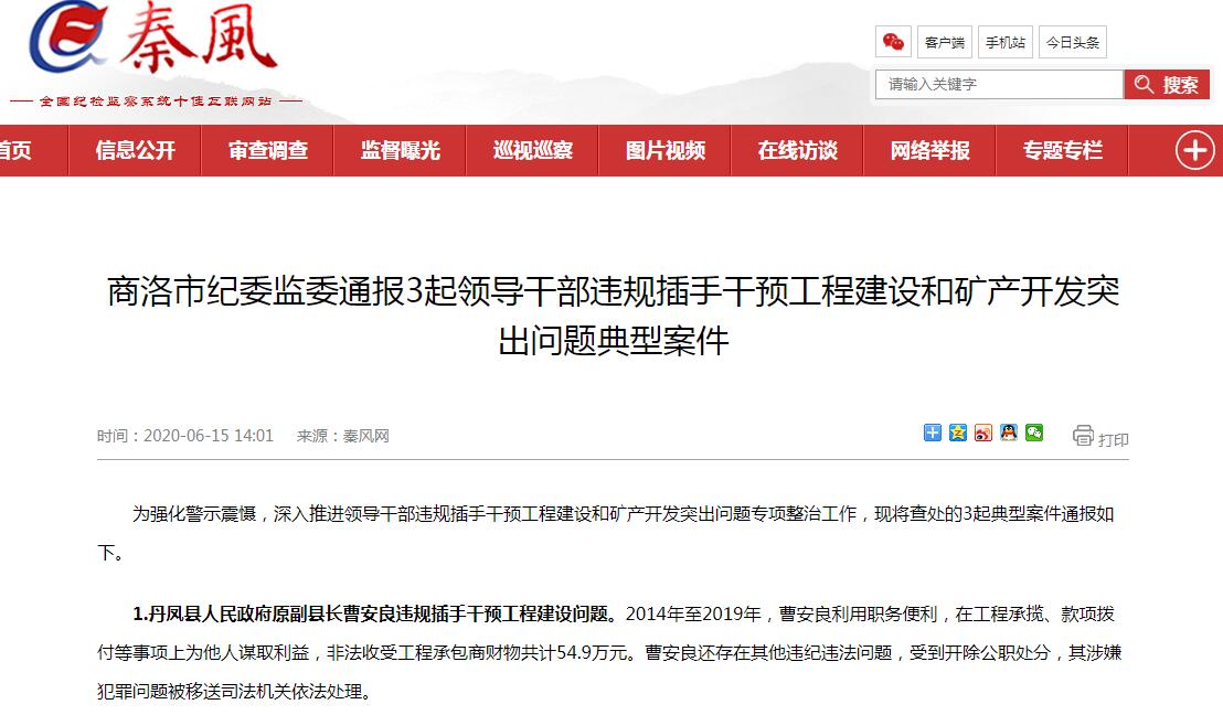 1.丹鳳縣人民政府原副縣長(zhǎng)曹安良違規(guī)插手干預(yù)工程建設(shè)問(wèn)題。2014年至2019年,曹安良利用職務(wù)便利,在工程承攬、款項(xiàng)撥付等事項(xiàng)上為他人謀取利益,非法收受工程承包商財(cái)物共計(jì)54.9萬(wàn)元。曹安良還存在其他違紀(jì)違法問(wèn)題,受到開(kāi)除公職處分,其涉嫌犯罪問(wèn)題被移送司法機(jī)關(guān)依法處理。