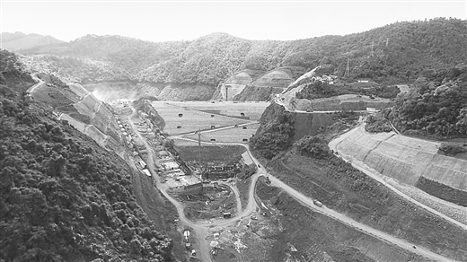 廣西左江治旱馱英水庫及灌區(qū)工程建設(shè)工地鳥瞰。