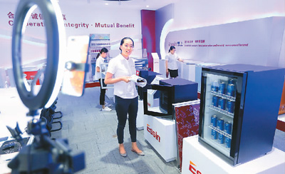 6月15日,為期10天的第127屆廣交會(huì)在網(wǎng)上開(kāi)幕,這是中國(guó)首次完全以網(wǎng)絡(luò)形式舉辦的廣交會(huì)。廣交會(huì)按16大類商品設(shè)置50個(gè)展區(qū),全部免收參展費(fèi)用,幫助企業(yè)減負(fù)紓困,開(kāi)拓國(guó)際市場(chǎng)。圖為6月15日,位于山東省青島市的青島營(yíng)上電器有限公司,營(yíng)銷人員通過(guò)廣交會(huì)直播平臺(tái)推介出口到非洲等海外市場(chǎng)的冰箱產(chǎn)品。梁孝鵬攝(人民視覺(jué))