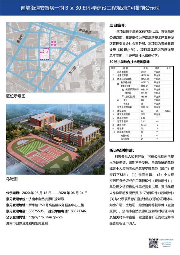 遙墻街道安置房一期B區(qū)30班小學(xué)建設(shè)工程規(guī)劃許可也進(jìn)行了批前公示。項(xiàng)目位于高新區(qū)荷花路以西、青銀高速公路以南,建設(shè)單位為濟(jì)南高新技術(shù)產(chǎn)業(yè)開發(fā)區(qū)管理委員會社會事務(wù)局。項(xiàng)目為普通教育設(shè)施30班小學(xué)。學(xué)??傆玫孛娣e29791㎡,總建筑面積19608.88㎡,配有4層教學(xué)綜合樓、配套綜合樓、多功能教室、室外衛(wèi)生間、活動場地、看臺、傳達(dá)室等,50個機(jī)動車停車位。