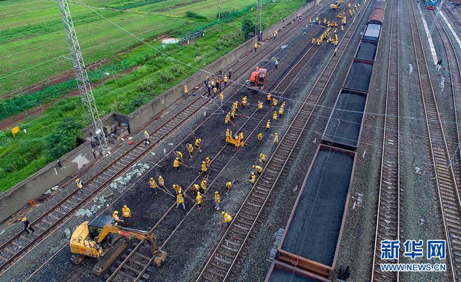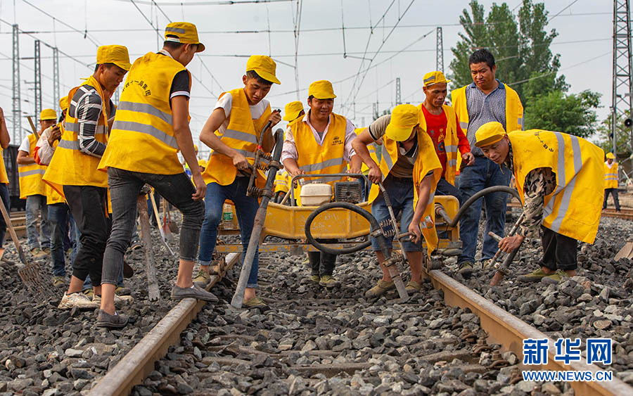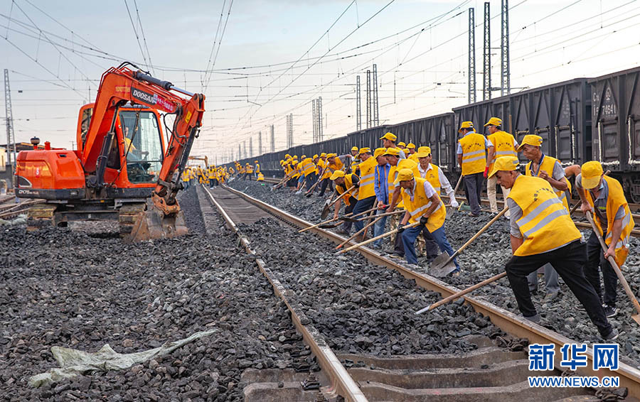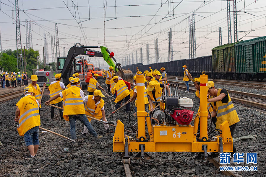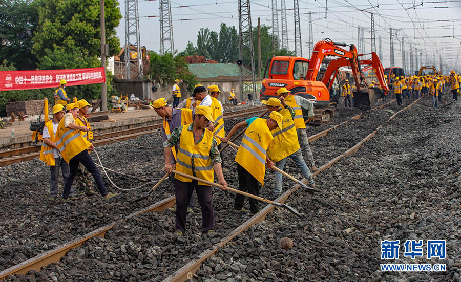 6月29日,千余名中鐵十一局工程人員在位于湖北省襄陽市的焦柳鐵路郜營站實施擴能改造工程作業(yè)。 新華網(wǎng)發(fā) 楊東攝