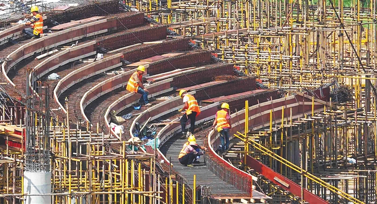 7月8日,在儋州市體育中心“一場(chǎng)兩館”項(xiàng)目建設(shè)現(xiàn)場(chǎng),體育場(chǎng)和體育館正在進(jìn)行主體結(jié)構(gòu)施工建設(shè),游泳館仍處于基礎(chǔ)施工階段,工程車輛來往穿梭,工人正忙著施工。