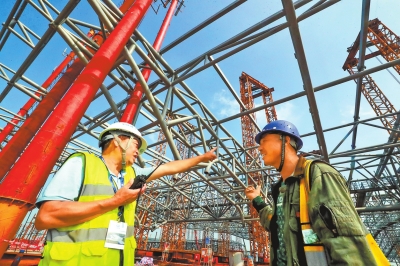 “因屋面坡度較大,首片鋼桁架分為兩次提升,先將中間區(qū)段提升5米左右,與兩側(cè)區(qū)段嵌補(bǔ)拼裝,再整體提升約21米到設(shè)計(jì)高度。”楊石杰說(shuō)。