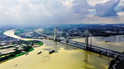 7月22日拍攝的廣州南沙港鐵路跨西江特大斜拉橋最后一組斜拉索吊裝現(xiàn)場(無人機照片)。 當日,中鐵十一局承建的粵港澳大灣區(qū)基礎設施“硬聯(lián)通”重點工程——廣州南沙港鐵路跨西江特大斜拉橋完成最后一組斜拉索吊裝,大橋預計在7月底合龍。該橋位于廣東佛山市和江門市交界處,全長1117.5米。 新華社記者 劉大偉 攝