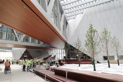 走進(jìn)天津茱莉亞學(xué)院項(xiàng)目,現(xiàn)場(chǎng)呈現(xiàn)出一片繁忙的施工景象。各參建單位正有序進(jìn)行幕墻、精裝、機(jī)電安裝、普裝工程收尾及園林景觀石材鋪貼施工等工作。項(xiàng)目?jī)?nèi)4個(gè)聲學(xué)要求最高的單體項(xiàng)目中,黑盒劇場(chǎng)精裝修已基本完成。目前,現(xiàn)場(chǎng)施工人員921人,正在緊密?chē)@8月份完成竣工驗(yàn)收備案、9月份順利開(kāi)學(xué)的目標(biāo)全力以赴,加班加點(diǎn)追趕工期。