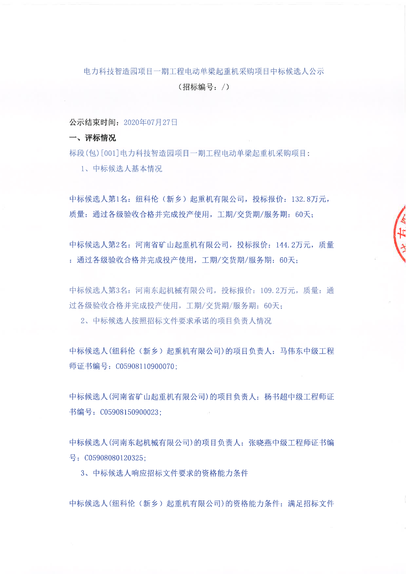 移動版:電力科技智造園項目一期工程電動單梁起重機采購項目中標候選人公示