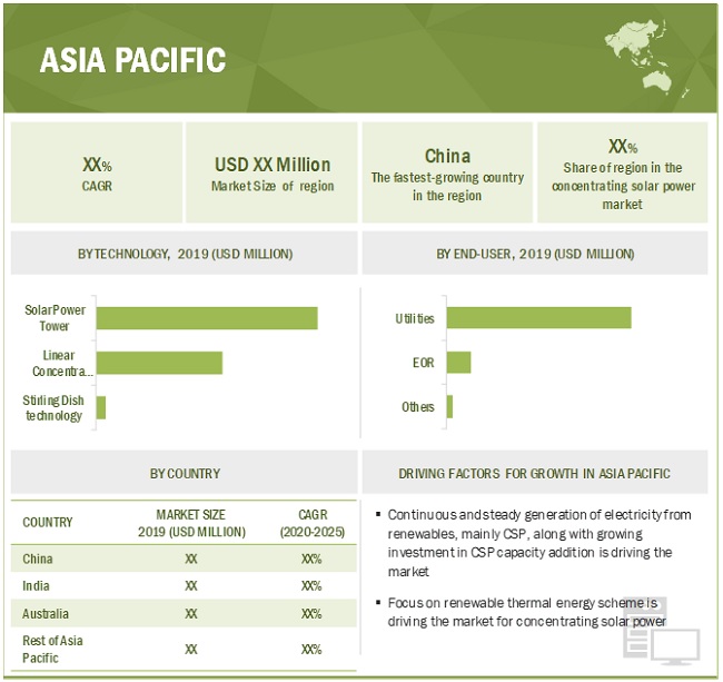 從技術(shù)上講,在預(yù)測期內(nèi),太陽能塔架部分是聚光太陽能市場中最大的貢獻(xiàn)者。從2020年到2025年,太陽能塔架細(xì)分市場引領(lǐng)著集中式太陽能市場。由于溫度更高,太陽能塔架細(xì)分市場得到了提升,可以提高蒸汽循環(huán)效率并減少冷卻用水量冷凝器。較高的溫度使用熱能存儲來實現(xiàn)可調(diào)度的發(fā)電。因此,由于成本降低或以相同的價格允許更大的存儲量而增加的太陽能塔架的采用,預(yù)計將在預(yù)測期內(nèi)以最快的速度推動太陽能塔的發(fā)展。