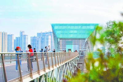 創(chuàng)新的元素在這里閃耀生輝??鐤|渡路的和熙樓,采用梁式橋及張弦梁結(jié)構(gòu)解決跨東渡路、軌道2號(hào)線連接狐尾山的難題,結(jié)合電梯筒采用鋼結(jié)構(gòu)多層螺旋吊橋的建筑形式為國(guó)內(nèi)首創(chuàng);和美橋全橋長(zhǎng)226.7米,所采用的單塔單索面曲線懸索結(jié)構(gòu)跨徑達(dá)216.7米,成為世界同類橋型人行橋最大跨徑。
