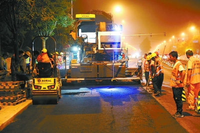▲今日凌晨,施工人員正在鋪撒瀝青混凝土。
