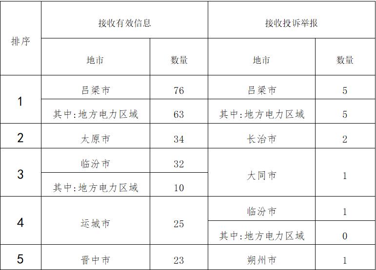 各地市按照收到的有效信息數(shù)量排序,呂梁市、太原市、臨汾市、運(yùn)城市、晉中市等列轄區(qū)內(nèi)前5位;按照投訴舉報(bào)數(shù)量排序,呂梁市、長(zhǎng)治市、大同市、臨汾市、朔州市等排在轄區(qū)內(nèi)前5位。(2020年6月有效信息及投訴舉報(bào)排名前5位情況見(jiàn)表三)