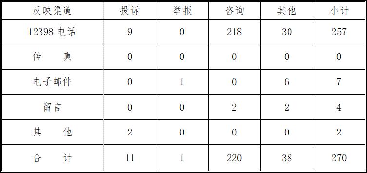 按反映渠道分類,12398電話257件,電子郵件7件,留言4件,其他2件。(2020年6月收到有效信息情況見(jiàn)表一)