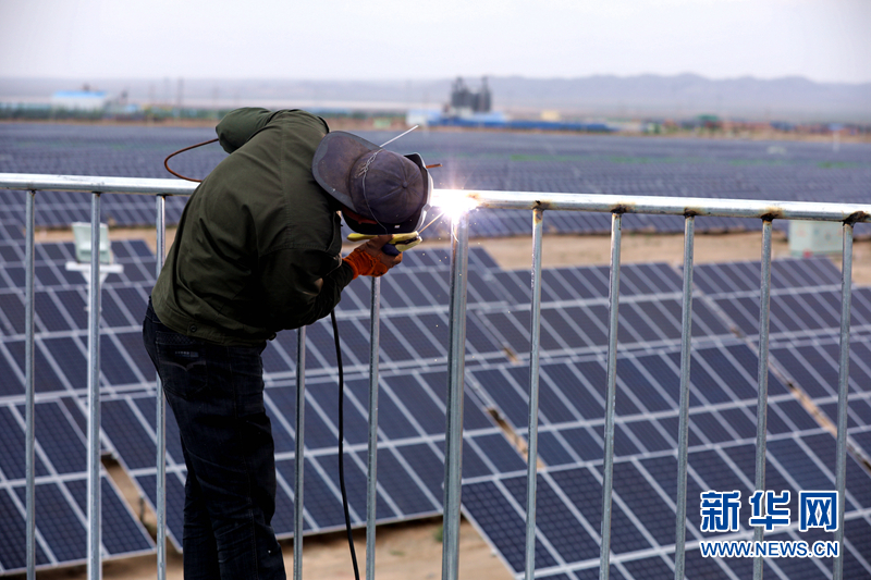 工作人員正在景泰縣光伏扶貧電站進(jìn)行維護(hù)工作。 新華社記者 郭剛 攝
