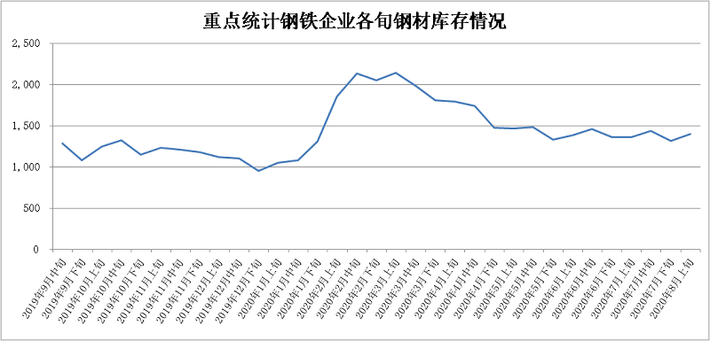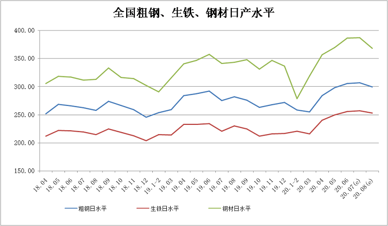 2020年8月上旬,重點統(tǒng)計鋼鐵企業(yè)共生產(chǎn)粗鋼2153.45萬噸、生鐵1917.04萬噸、鋼材1998.98萬噸、焦炭323.76萬噸。本旬平均日產(chǎn),粗鋼215.34萬噸,環(huán)比減少0.87%、同比增長5.14%;生鐵191.70萬噸,環(huán)比減少0.66%、同比增長5.39%;鋼材199.90萬噸,環(huán)比減少8.30%、同比增長4.95%。
