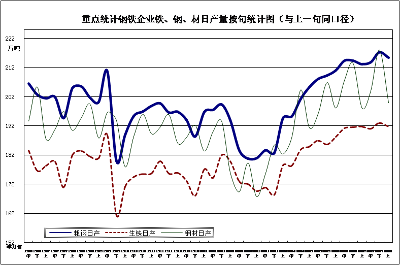 [1]因企業(yè)重組,河北縱橫自本旬起從統(tǒng)計樣本中剔除。若按本旬口徑,本旬生鐵、粗鋼日產(chǎn)量分別比上一旬增長0.41%、0.12%。受鞍鋼集團ERP取數(shù)原則和部分企業(yè)月底集中入庫等因素影響,本旬鋼材產(chǎn)量相比上一旬減少較多;按本旬口徑,并剔除這些影響因素,本旬鋼材日產(chǎn)量相比上一旬減少4.0%。