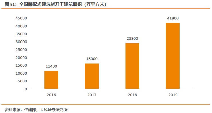 發(fā)展階段:隨著技術(shù)和體系的不斷完善,裝配式建筑也從適用階段邁向推廣階段。目前我國處于裝配式建筑的快速發(fā)展階段。根據(jù)住建部統(tǒng)計數(shù)據(jù),2019年新開工裝配式建筑面積開達到4.2億平米,近4年復合增長率達到55%。2020年08月28日,住建部等部門聯(lián)合發(fā)布《關(guān)于加快新型建筑工業(yè)化發(fā)展的若干意見》,明確提出大力發(fā)展鋼結(jié)構(gòu)建筑,并推廣裝配式混凝土建筑??梢娢覈鳳C結(jié)構(gòu)已發(fā)展較為成熟,進入到推廣階段。我們認為伴隨國家政策的不斷加碼以及產(chǎn)業(yè)鏈的迅速崛起,在我國龐大的建筑市場下,裝配式建筑有望繼續(xù)加速發(fā)展。