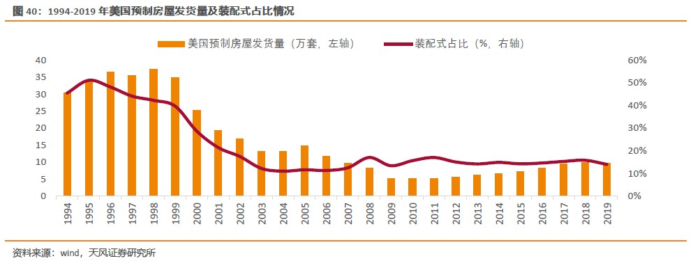 從過去近30年歷史來看,90年代美國預制房屋發(fā)貨量穩(wěn)定在30萬套以上,裝配式占比在40-50%,1998年預制房屋發(fā)貨量達到37.31萬套,達到近30年最高值。隨后美國開始調(diào)結(jié)構(gòu),減少低端裝配式房屋占比,此后預制房屋發(fā)貨量和占比均呈下滑趨勢,到2019年美國預制房屋發(fā)貨量9.46萬套,裝配式占比為13.9%,主因前期低端裝配式住宅總量較多所致。