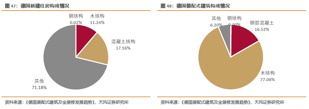 根據(jù)德國聯(lián)邦統(tǒng)計局數(shù)據(jù),2017年新建居住建筑中裝配式占比11.91%,非居住建筑的裝配式占比為50%。裝配式建筑中木結(jié)構(gòu)占比高達77.08%,鋼筋混凝土結(jié)構(gòu)占比16.52%,鋼結(jié)構(gòu)占比0.2%。