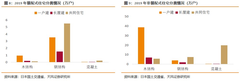 住宅建筑方面,日本裝配式更多應(yīng)用于共同住宅(公寓或高層住宅),一戶建(類似獨棟別墅)、長屋建(類似聯(lián)排房屋)則應(yīng)用較少。2019年裝配式住宅中有48.7%為共同住宅,37.6%為一戶建,13.7%為長屋建。在占比最高的共同住宅中鋼結(jié)構(gòu)占比高達95.2%,木結(jié)構(gòu)、混凝土結(jié)構(gòu)分別僅占1.8%、3.0%。而一戶建中鋼結(jié)構(gòu)占比78.7%,木結(jié)構(gòu)、混凝土結(jié)構(gòu)分別占20.5%、0.8%。